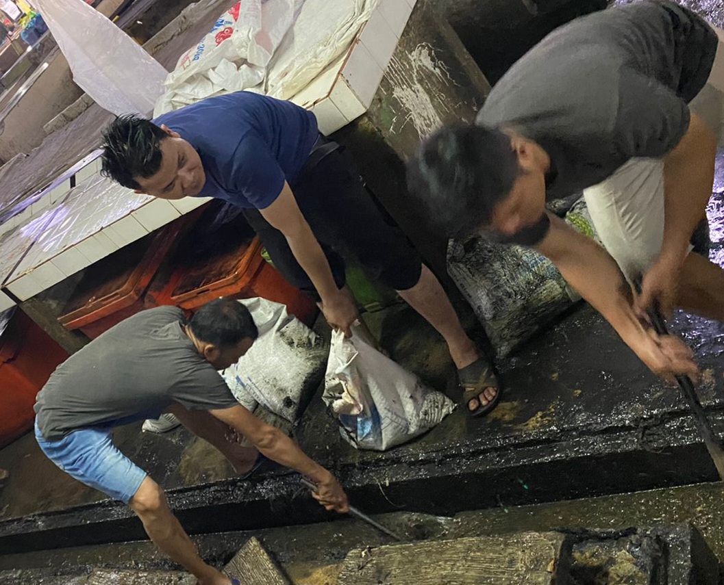 Pembersihan meliputi pengorekan parit-parit yang mulai tersedimentasi oleh limbah ikan yang dijual pedagang dengan menggunakan alat seperti cangkul, sapu lidi, dan alat kebersihan lainnya.